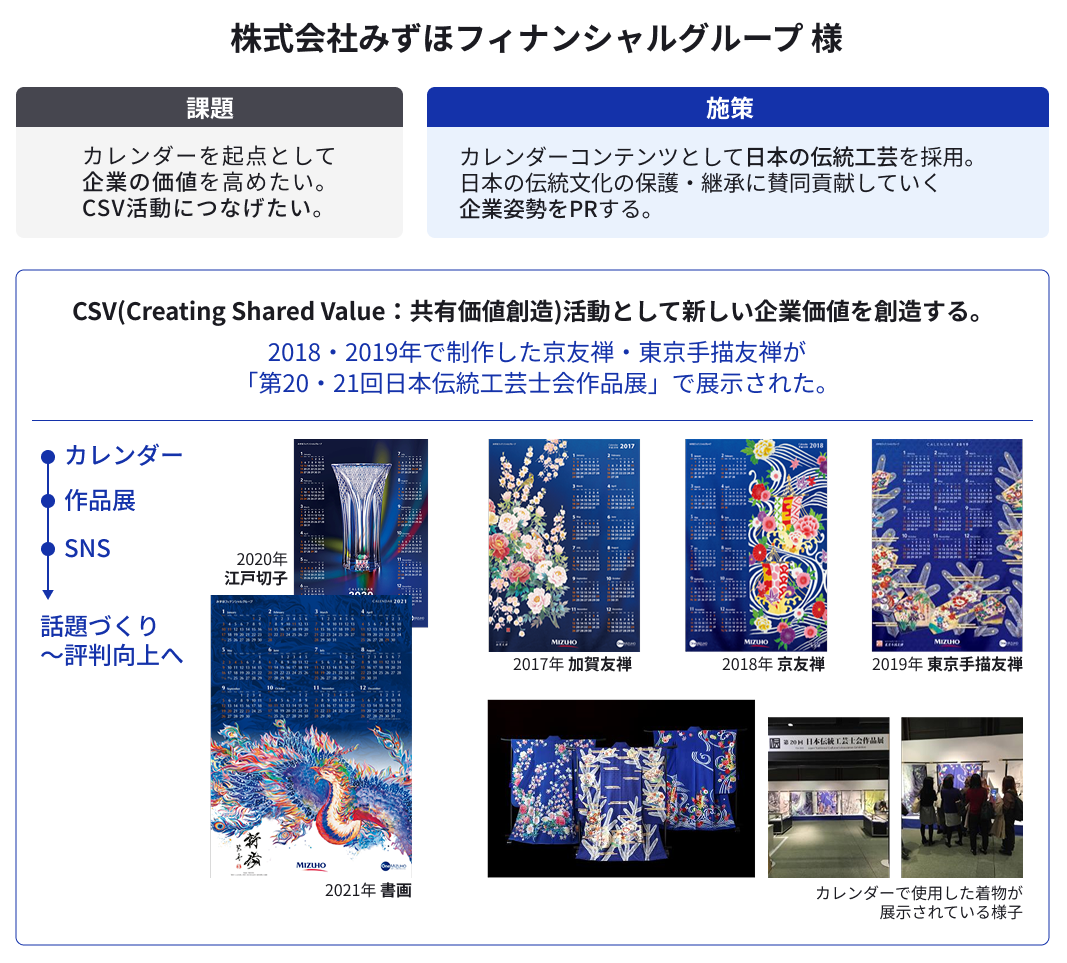 また、あらためて「工藝」とのコラボレーションに注目しています。日本の文化や風土を色濃く受け継いでいる伝統工藝。それを培う技術の価値は、新たな現代作家の視点や解釈も加わり今後ますます高まっていくはずです。実績は、株式会社みずほフィナンシャルグループ様とのプロジェクトで、オリジナルの友禅染を作成してカレンダーのビジュアルに採用いただきました。