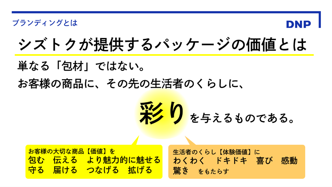 そのプロセスを通して、単純に「ものを包む・守る」という機能だけでなく。そこに「デザイン」という要素を加えて、商品価値の向上に努める点にシズトク様の独自性や本質的な強みがあると考え、リブランディングのコンセプトの軸として「彩り」という言葉を提示しました(※)。