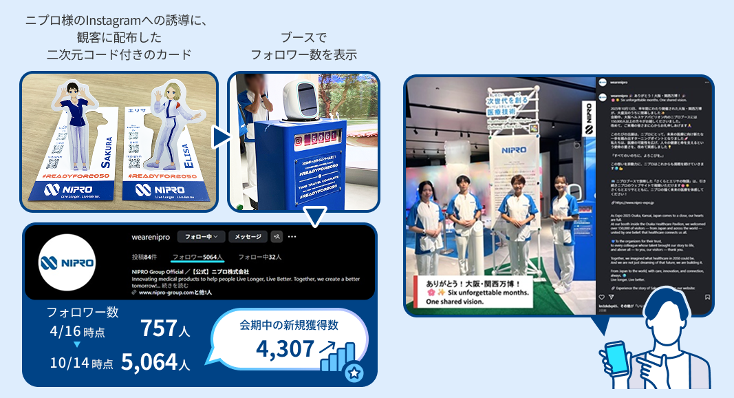DCD・田辺:事前に定量的な目標として「会期中のブース来館者数・15万人、ブースからの送客でInstagramのニプロ公式アカウントのフォロワー数5,000人達成(約4,000人の増加)」を掲げていました。結果的に来館者数はトータルで155,372名、フォロワーは4,307人増加で着地し、どちらも達成することができました。
