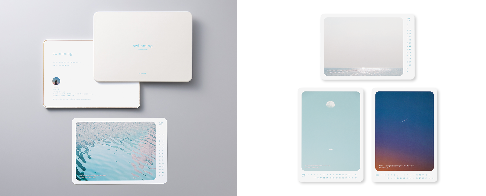 情報があふれている日々に、そっと空白を与えてくれるような空気感をミニマルに表現する写真家、アスパラ氏の作品を使用したカレンダーです。各月に写真家の想いを込めたコピーを添え、日常と非日常の境界をたゆたうような、ゆめうつつな空間を演出。コンパクトな小型形状を、滑らかな質感が特徴のシルキーモウルドのパッケージに収め、手に取る瞬間から静かな余韻を感じられるたたずまいとしました。印刷は、ブロードインキの広演色ならではの滑らかなグラデーションで、はかなくもぬくもりのある柔らかい空気をまとったデザインに仕上げました。