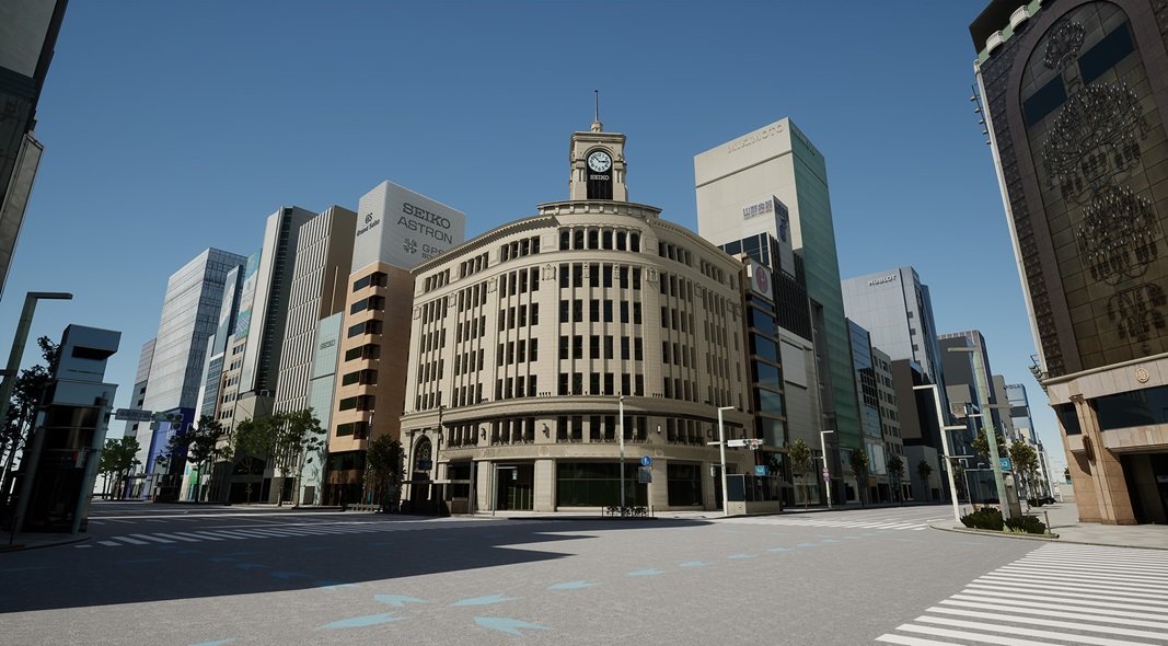 - 注釈バーチャルプロジェクションとは:スタジオの大型スクリーン等に3DCGの仮想的な背景等を投影し、その前に人や物を配置すること。銀座四丁目交差点バーチャルプロダクションでは、高精細3DCGデータを制作した。